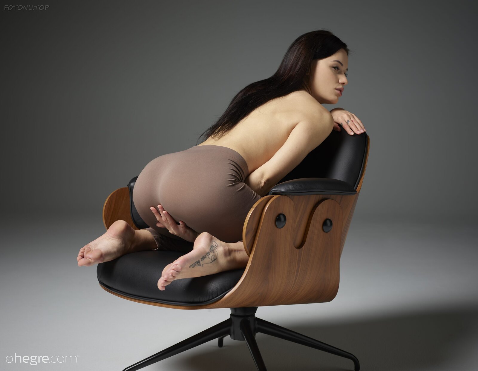 Молодая брюнетка в лосинах светит красивой попкой в кресле