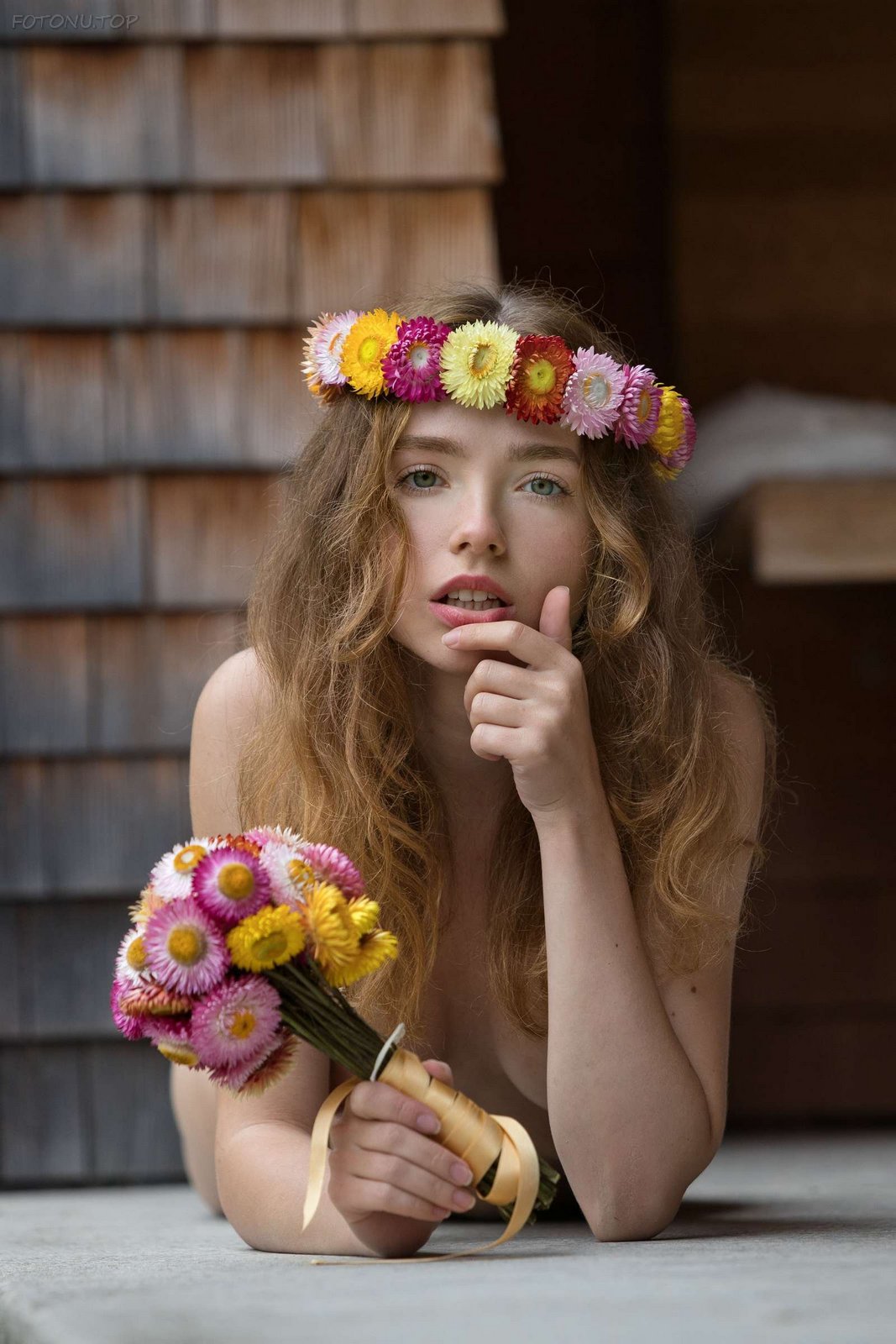 Описание: Гуляя возле своего дома, симпатичная сельская девчонка с кудрявыми волосами сплела себе венок из полевых цветов и надев его себе на голову, принялась позировать перед объективом камеры. Не скромная молодая телка с красивой большой грудью, не став стесняться, сняла длинную белую юбку и начала показывать красоты сексуального тела, хвастаясь упругой попкой и гладко выбритой киской.